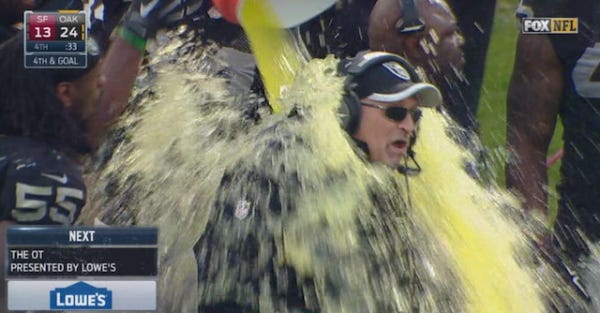 A Gatorade bath from the players after beating a mediocre team. This is a sign that even a victory over a nobody is a source of pride for your team. That won’t cut it in the NFL.