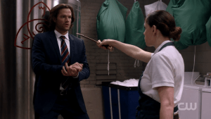 Lynn: I think that’s part of Eileen’s charm, so you weren’t bad at it at all! I loved that little moment. And while I actually hope that the show never tries to add an actual romantic relationship to Sam or Dean’s lives–because I just don’t think it’s that show or that it makes sense for the way the Winchesters live–I do really hope that Eileen survives and returns. And I wouldn’t mind more of that flirting. Do you think the character’s chances are good considering what an experienced hunter she is, or is the British Men of Letters’ death sentence likely to do her in?