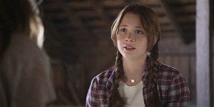 Not sure most people would actually say something like that out loud, but Geri is sweet with the kids and clearly cares about them. The kids bed down in the barn, and Geri comes to sit with Walker – on a hay bale because of course it’s on a hay bale! I’m developing an appreciation for the unique aesthetic that this show has – it’s not realism so much as a representation of what a cozy barn would be like, lantern hung from a post, neat bales of hay to sit on, no cobwebs. It’s not gritty like Supernatural was in its aesthetic, but it’s sort of calming and pleasing in its own way.