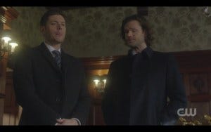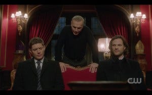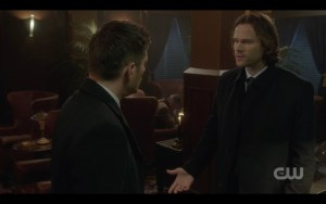 Now we’re in a scene from The Godfather complete with lap cat and opera music and Sam and Dean look damn good in all that red opulence.