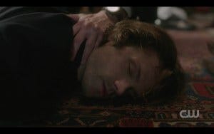 Until he gets whacked on the head after finding a piece of paper with a code on it, that is. Ouch. Dean comes looking for his brother soon after, bursting into the room and then seeing Sam lying on the floor.