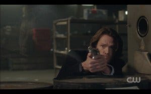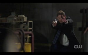 A lot of Winchester badassery then ensues, with a gunfight worthy of the best classic film and complete with a kickass musical score of religious music to make it both surreal and strangely beautiful and a nice homage to films that have done the same. Dean comes in guns blazing, wielding double fisted handguns, slow motion bullets flying and people going down, the Father saving Dean and getting grazed in the process, but the good guys prevail.