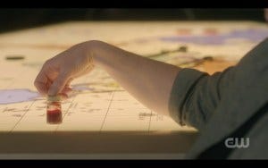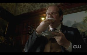 Next player is Antonio someone, who doesn’t have a big part because he’s already dead when the Winchesters find him. The Patricia Hotel is another beautiful set by Jerry Wanek and company that looks like it’s been frozen in time (and could be the lobby of the Tower of Terror). No sooner do Sam and Dean mutter a “what the hell” than a gruff guy appears and orders them to cuff themselves to the radiator. The Winchesters are not very intimidated by Mr. Fake Cop (which they realize immediately) even when they’re cuffed to the radiator, which earns Dean a gun to the temple and makes me need a cold drink.