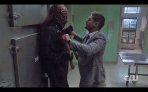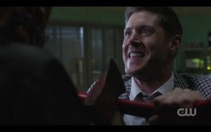 For the fourth Season 14 episode in a row, we get a fight scene. This one included Dean deploying some handy dandy bedpans, though I’m not sure why those were in the morgue, come to think of it. Eventually Hatchetman flings Dean to the ground and raises his axe. Dirk proves his bravery again by stabbing the ghost in the back, giving Dean time to get up. But soon Hatchetman immobilizes Dirk and has Dean in a stranglehold.