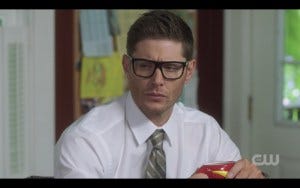 Sam and Dean, still in their attractive insurance dudes outfits, visit Stuart at his mom’s. She makes them apple cider in a cat mug and a superhero mug (which Dean quickly grabs for himself). Oh and did I mention that Dean is now wearing glasses??? That was enough to make most of us in the room gasp out loud and then grin from ear to ear.
