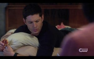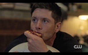 Back to the bunker, where Dean Winchester is sprawled out on his bed, socked feet up on the nightstand, head on a pillow watching television and eating pizza. Let me repeat. Dean Winchester is sprawled out on his bed. The camera doesn’t exactly do a slow pan as in that early seasons episode (you know the one, black boxers, tee shirt…) but it’s a nice visual, just saying.
