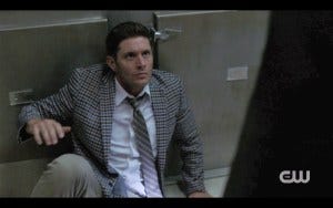 At that moment, Stuart runs out screaming and bloodied. Sam helps him while Dean goes in, gun at the ready. He’s dressed in the world’s ugliest jacket and should look ridiculous but somehow he just looks hot anyway.