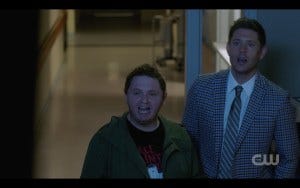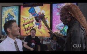 This whole exchange was hilarious. Jared Padalecki’s comic skills are under appreciated sometimes, and they were in full view here as Sam awkwardly maneuvers to get Samantha out of the shop without telling her there’s a ghost in there with them. Hatchetman appears before he succeeds and knocks poor Sam out.