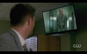 As Dean talks to Sam, Hatchetman walks toward Dean through hospital corridors – on the TV screen in Stuart’s hospital room! So deliciously meta.