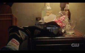 Samantha is established as both smart and savvy right away, a subtle eyeroll giving away the fact that she doesn’t quite buy their obvious rockstar aliases. Genevieve Buechner did a fabulous job with this role, making Samantha a memorable character even in the little bit of time we got to see her. She gives Sam and Dean a bit more information on Stuart, including that he’s an internet troll and is now living with his mother.