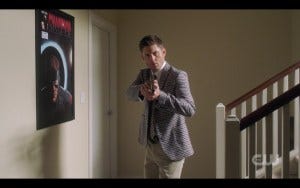 I had to squee again when we see that the comic shop has a life size Red Hood figure (which Jensen Ackles posted a photo of on his Instagram during filming, and then wore a full out cosplay for Halloween which just about broke the internet). That was a lovely meta shout out, since Ackles voiced Red Hood for the animated feature. There’s also a poster for “House Of Wax”, the horror movie that Jared Padalecki starred in.