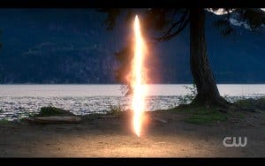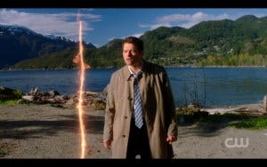 Then something unanticipated happens, which always makes me happy. I love that Show can still surprise me after all these years! The about-to-be-born Nephilim’s energy opens a portal and Cas, fearless and curious being that he is, walks right through it. (If I were him, one thing I would have learned is NOT to expect an unknown portal to lead to anywhere remotely good…)
