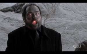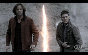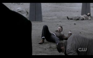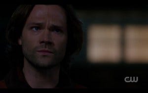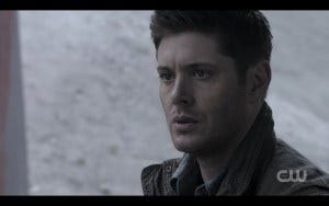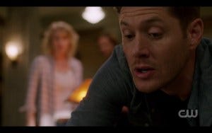 Bobby explains that in this world, the earth is locked in eternal war between angels and demons, both of whom are dicks, with the humans who are left caught in between. It’s a bombed out, bleak, apocalyptic world where John Winchester died forty years ago and Mary Campbell grieved him for thirty and then was killed by Azazel. It’s a world where Sam and Dean Winchester were never born.