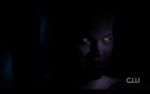Inside the house, Sam finds Kelly dead and closes her eyes, and then follows a trail of bloody footsteps through the darkened house. He gasps as he sees the glowing yellow eyes of the Nephilim sitting hunched in a corner.