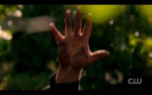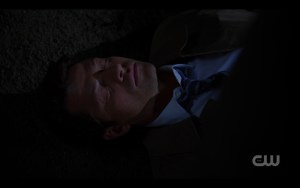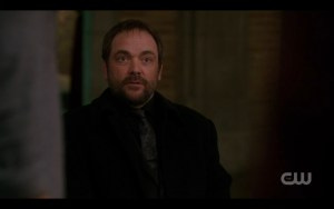 I’m not sure why we had to be shown the entire Crowley-smoked-into-the-rat-and-here’s-what-happened-next chain of events. Honestly, Show, we’re smarter than that. Everyone knew Crowley was in the rat, you made it very obvious. Sigh. Anyway, Crowley gets out of the rat and back into his buried body, and we get to see him thrust his hand up through the dirt with a nice call back to Dean doing the same in season four. I loved the way Bob Singer directed that scene. Crowley’s back! My relief, as we all know, was to be short lived.