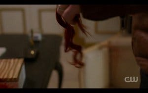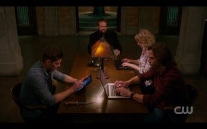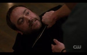 We get a bit of smart Winchesters, and then they’re off to track down Cas and Kelly, leaving Crowley behind with his hand knifed to the table by Dean. Ouch. But also, badass Dean, mmm.
