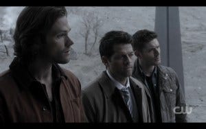 I was so exuberant over Supernatural’s penultimate episode of the season that I went into the finale episode already an emotional wreck – in the very best of ways. I honestly sort of wanted a while to just savor all those wonderful warm feelings, but of course Show just couldn’t let me do that. I barely had time to grab another glass of wine before the familiar notes of Carry On Wayward Son were making me even MORE emotional. There are so many things that happen that are special when a television show has been on this long and had this much impact – even the band Kansas, who recorded that classic, tweeted about the season finale, knowing that every single fan was going to go nuts when Supernatural’s unofficial theme song was played.