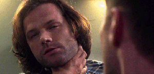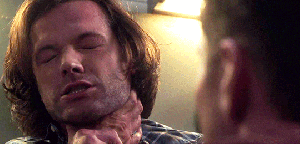 Dean finally gets Sam pinned against the wall, lifting him clear off his feet and choking him as he holds him there, helpless, dangling. The trust they have allows Jensen to seemingly really hold Jared pinned there and to really choke him, which means the scene comes across as startlingly, terrifyingly, real.