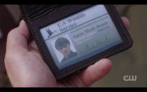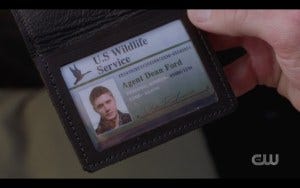 The Winchesters reprise their Fish and Wildlife ranger identities, using the same badges they did way back in Season 1 as Agent Ford and Hamill.