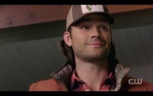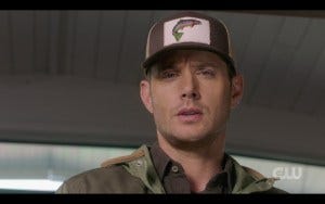 Before we leave this scene, Speight lingers deliberately on the hats that Sam and Dean are wearing – with a clearly depicted salmon on them. It’s a fandom in joke that everyone calls the brothers “SamandDean” which when you say it fast sounds like “Salmon Dean”. That became a thing one year at the Rome convention I was at, and Jared and Jensen have made fun of it ever since. So Dean and Sam wearing that cap? Yep. Salmon Dean.