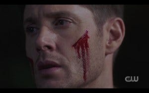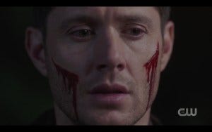 Sam desperately chokes out, “Stop, this isn’t you,” but Dean doesn’t listen. Jensen channels the exact energy and personality he used for demon Dean seasons ago, and he looks just as incendiary doing it as he did then. The way he looks up at Sam, savoring the moment, virtually leering at him, tongue poking out, made my breath catch as he slowly raises the first blade so Sam can see it.