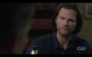 (Oh, Sam. And we’re finally getting some clarification that yes, that’s exactly what Sam has which feels SO good. Jared has played it like that for a long time, but it seems that was mostly Jared and not the writers giving Sam’s trauma acknowledgement. It feels good to have it clearly stated in canon. And what a statement, that it’s so bad that Sam just assumed these horrific dreams were his customary PTSD-related nightmares.)