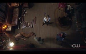 Meanwhile, Sam is out cold – and has another vision. Each one of the visions has been some of the most amazing Supernatural ever, and this one – OMG it was maybe the most amazing one yet. We have all lamented again and again how we wish we’d had more of demon Dean, and how sad it was that we’d never get it again. But that’s exactly what we got in this vision. Mark of Cain Dean fighting his brother, throwing him through the railing on the bunker landing! Stunt coordinator Rob Hayter confirmed that Jared did this scene himself, plunging down to land on the map table (a cushion I’m sure in real life). Apparently in one planned part of the scene, Dean jumps down to join him – hence the released still. That didn’t make the cut, but wow, what a scene!