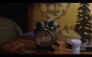 Ashley calls Dean, saying she has nowhere to go, and the Winchesters give her their room at the aptly named Sleepy Bear Inn (a shout out to writer Steve Yockey, whose twitter handle is @SleepyPanda76). Nothing makes you feel safe and welcome more than a statue of a giant bear holding a ‘Welcome’ sign.