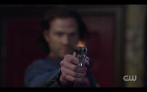 Unfortunately Lilith breaks out of the trap and traps Sam and Dean as they try to flee, freezing them in place while she looks for the gun. It’s conveniently in the glove box of the Impala, which makes little sense. I mean, at least couldn’t it be in the warded trunk? She destroys it before their shocked eyes, melting it into a puddle as director Speight gives us some truly spectacular closeups of the stricken Winchesters. Then Lilith is gone.