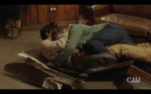 Much of my timeline reacted by screaming about Sam being Chuck’s horcrux. Will Sam’s ability to see inside Chuck’s head allow them to stay ahead of Chuck and make their own choices beforehand? Does Chuck have any idea that Sam is seeing into his head and all his endings? Somebody should probably “Freud” Chuck, and the sooner the better! The psychologist part of my brain is actually fascinated with who they’ve turned him into. I still think it’s a retcon of sorts, but they did lay the groundwork that would explain him being obsessed with the Winchesters. He has a big chip on his shoulder thanks to his troubled past (putting it mildly) and sense of betrayal with his own sibling. Does it drive him insane that Sam and Dean are as devoted to each other as they are? Someone smarter than me pointed out that in the demon Dean vision, Sam doesn’t have his arm in a sling, which means in that version, Sam never went crazy searching for and determined to save his brother. Is that what allows them to kill each other each time?
