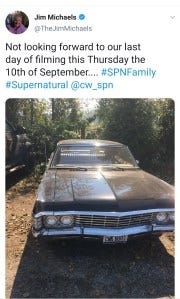 Knowing that today those characters will say their last words to each other is hard for me to get my head around. I can’t even imagine how hard it will be for them. Yesterday, on the second to last day of filming, some of the crew tweeted photos of the beautiful Vancouver locations they were filming at, and Jim Michaels and Kevin Parks shared photos of the Impala. I began to tear up immediately, thinking of the actors looking out over the familiar Vancouver beauty. I felt a rush of gratitude that Baby was there with them. They’ll need her comfort, and she’ll comfort them and keep them safe, just like she has for the past fifteen years.