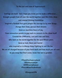 Today is the last day of filming for Supernatural, after fifteen seasons on the air. It took me a season to truly fall in love with the show, but once I did, I fell head over heels – and in fourteen years, I haven’t looked back. Others’ stories are different, but where we’ve ended up is the same. All over the world today, people whose lives have been touched by Supernatural are feeling the loss of something that is so much more than a television show. There’s a collective grieving, a sense of shared overwhelming emotion, that I’m grateful for – one of the most powerful things about fandom is its validation, and I feel that today. There are plenty of people in my everyday life who don’t really understand what a big loss this is, but there are plenty of people in the SPNFamily who do.