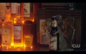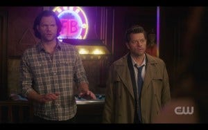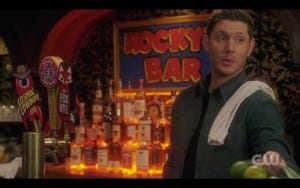 ‘Nihilism’ had some nostalgic touches, which almost always puts a smile on my face. I’ve been watching this Show for 14 years, and it feels good when the Show remembers its own history and acknowledges its own fandom. Dean’s fantasy world in his own head where Michael has trapped him is full of those touches – it’s Rocky’s Bar, complete with a stuffed squirrel wrapped around a Margiekugel’s beer bottle, a tap from “FB Beer Company” and references to “an IPA from Austin”. The little in-group nods to Dean’s nickname of ‘Squirrel’, a Scoobynatural nod with ‘Daphne Loves Fred’ carved into the bar, and Jensen’s real life (Family Business Beer Company) brewery in Austin were happy making.