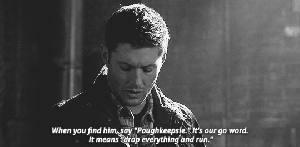 Dean, as Michael rages and bangs on the door: It’ll hold. My mind, my rules. I got him. I’m the Cage.