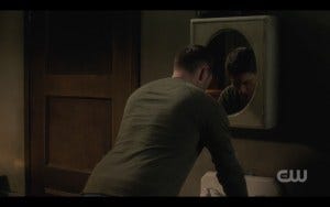 We end with Dean – in a friggin’ single layer Henley – confronting himself in the mirror as Michael bangs and screams and roars and rages in his head.