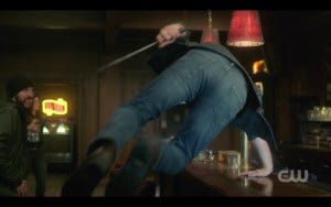 The fact that Dean’s fantasy world has him being a badass brawling bar owner (who’s famous…) repeatedly beheading attacking monsters was so perfect – so very very Dean. Of course he’d still be hunting monsters and saving people, even in a dream world! Also that gives us interesting shots like this…