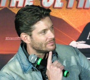 Jared had to fly in later than expected because he was moderating a panel on the new prequel Walker: Independence in Austin, so Jensen stayed behind too to fly into Chicago with him. On the way on the plane, Jensen showed Jared the Termite scene from episode one of Season 3 of The Boys. This is the grin on Jensen’s face when he told us that, and I’m sure the grin on his face when he saw Jared’s reaction too. (If you haven’t seen it, it’s a unique combination of sexual and disturbing that only The Boys could pull off!)