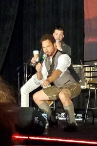 Friday also had a great trio panel of Gil McKinney, Adam Fergus and David Haydn-Jones. They joked that it was the “grumpy old men of letters panel”! It was Pride month, and David had on his Yasssss Queen shirt given to him by a fan and some truly awesome rainbow socks.