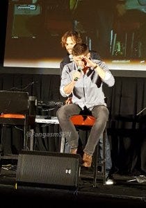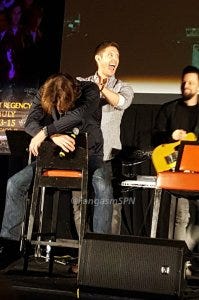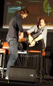 There was also the hilarious re-enactment of Jared and Jensen happening upon Sebastian Roche in one of those quick massage places in an airport. Since Sebastian’s head was down, Jared snuck up behind him and replaced the woman’s hands on Sebastian’s back with his own.