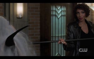 R: I worked on the reveal, yes. Her style, that’s wardrobe. Her hair, that’s Trish. They kinda have decided what that should be visually, with Ruth’s input, because they wanted it to have the impact you’re discussing. I had a visual and a whole tone that I wanted that scene to take. So I didn’t take liberties but I talked to Brad and Eugenie (the writers of the episode) about things I wanted to do and they were cool with it. For example, that fight that happens before you realize she’s the Queen of Hell. In the script it says the boys are attacked by armed male demons. There’s a fight, one of the demons gets killed and the boys get interrupted by the voice that turns out to be Rowena. And I pitched — and was able to successfully lobby for — I want it to be all females and I want them to be unarmed because what I wanted was to reverse the hell order. So she comes down the stairs surrounded by beefy men.