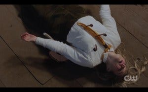 R: You believed that she was in distress, you believed that she was a victim in this scenario, that she was in peril and incapable of doing anything to defend herself. And she’s completely distraught by what she’s witnessed and probably damaged for life, and then she stumbles and dies on those antlers and it’s a WTF moment of massive proportion.