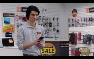 L: Oh no, that’s gonna make me emotional, thinking about you hugging Serge goodbye. He wrote a chapter for our second book and I guess I’ll never get to hug him goodbye… Okay, let me pull myself together. I have a few questions about the third episode you directed this season, Galaxy Brain. I really liked that opening scene with Rob in the Radio Shed, with Louden Swain playing – awesome! And that guy who played the clerk was so good too. “Sir, this is a Radio Shed…” (laughing)