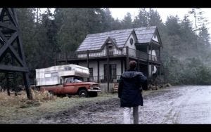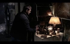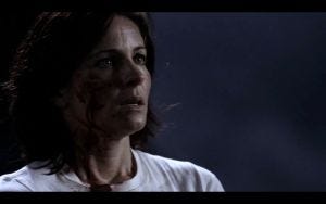 The door to Jenkins’ cage mysteriously unlocks. Sam immediately knows that was way too easy, and tells Jenkins to just stay in cage, but of course he runs anyway. It’s a disturbing scene, Jenkins running outside in the rain in the dark woods. He finds a knife (conveniently) and takes off, hearing eerie whooping sounds in the woods as the Benders pursue him. They toy with him like a cat with its prey, beating him with sticks and then letting him run again, terrified in the fog and rain, the eerie whoops pursuing him. They slice his leg and let him keep staggering away, wounded, before finally stabbing him to death.