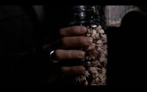 Jerry Wanek and crew really outdid themselves on the set dec, photos on the walls of their trophy kills, posing with dead people like big game hunters, a glass full of teeth, scary things in jars. Dean makes his way through the dark house with a flashlight, bumping into bones made into mobiles hanging from the ceiling.