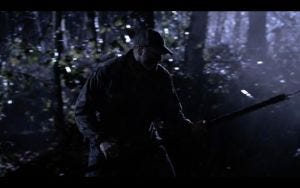 The dad gives a truly disturbing speech about hunting all his life, deer and bear “but the best hunt is human, there’s nothing like it, holding their life in your hands and seeing the fear in their eyes just before they go dark, makes you feel powerful.”