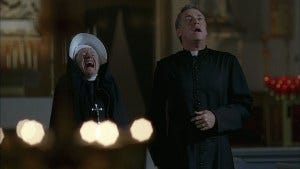 The nun screams bloody murder, and we get the title card in a perfect juxtaposition.