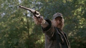 In a little interlude, we get what I think was the only Bobby and Ruby scene in the whole show. Bobby’s shooting at a feedbag hanging from a tree, testing the Colt.