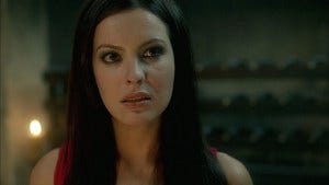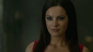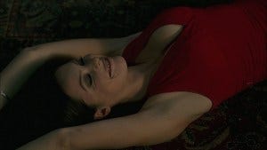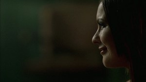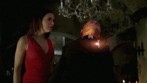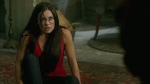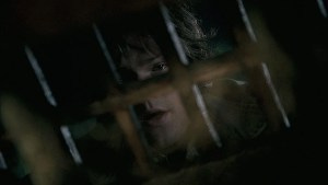 Uh oh. She blinks and her eyes are black. He pulls a knife from his boot but she’s quicker, stabbing him and then breaking his neck, twisting it gruesomely all the way around. Nice VFX!