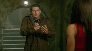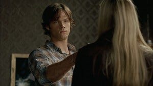 In a perfect comedic moment, Sam appears in frame and grabs Dean by the shoulders to move him along, smiling apologetically at the woman.
