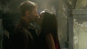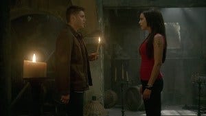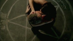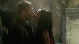 Father Gil breaks the devil’s trap and kisses Casey passionately as Dean struggles up.